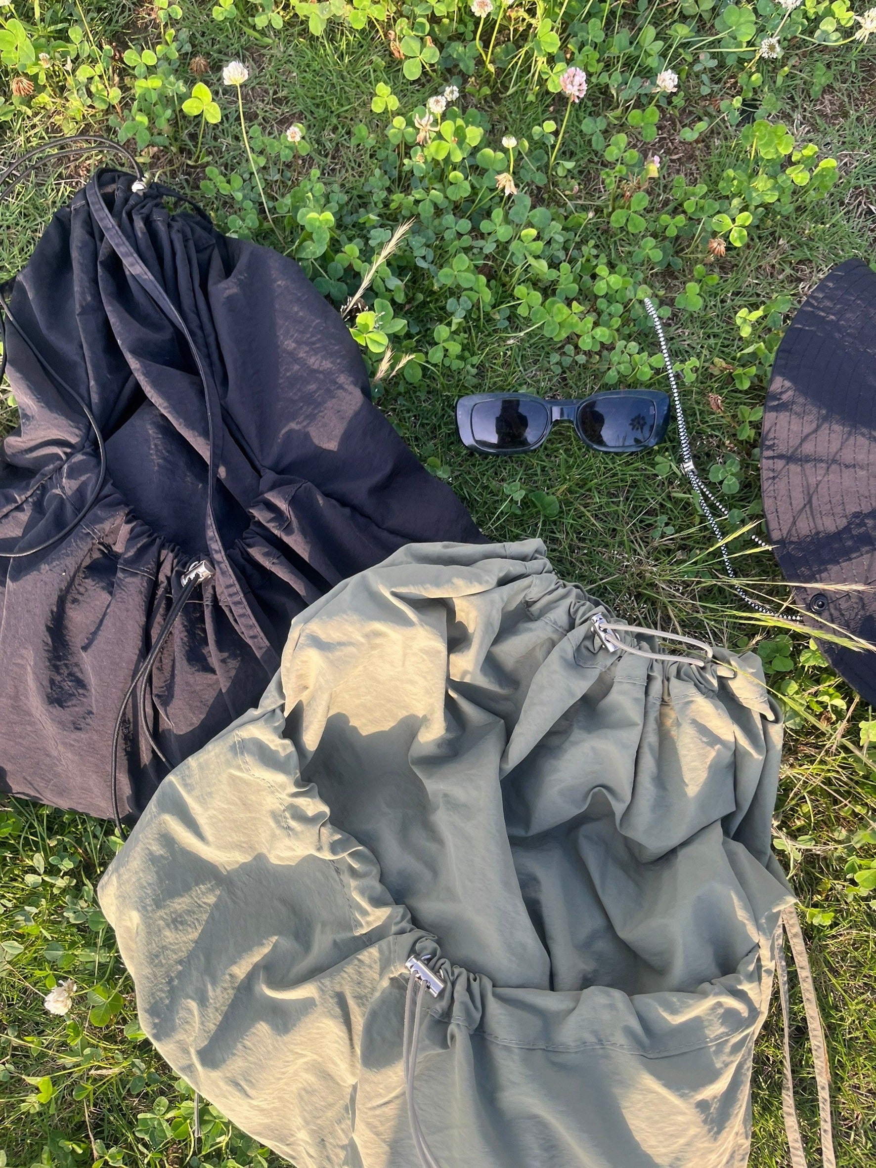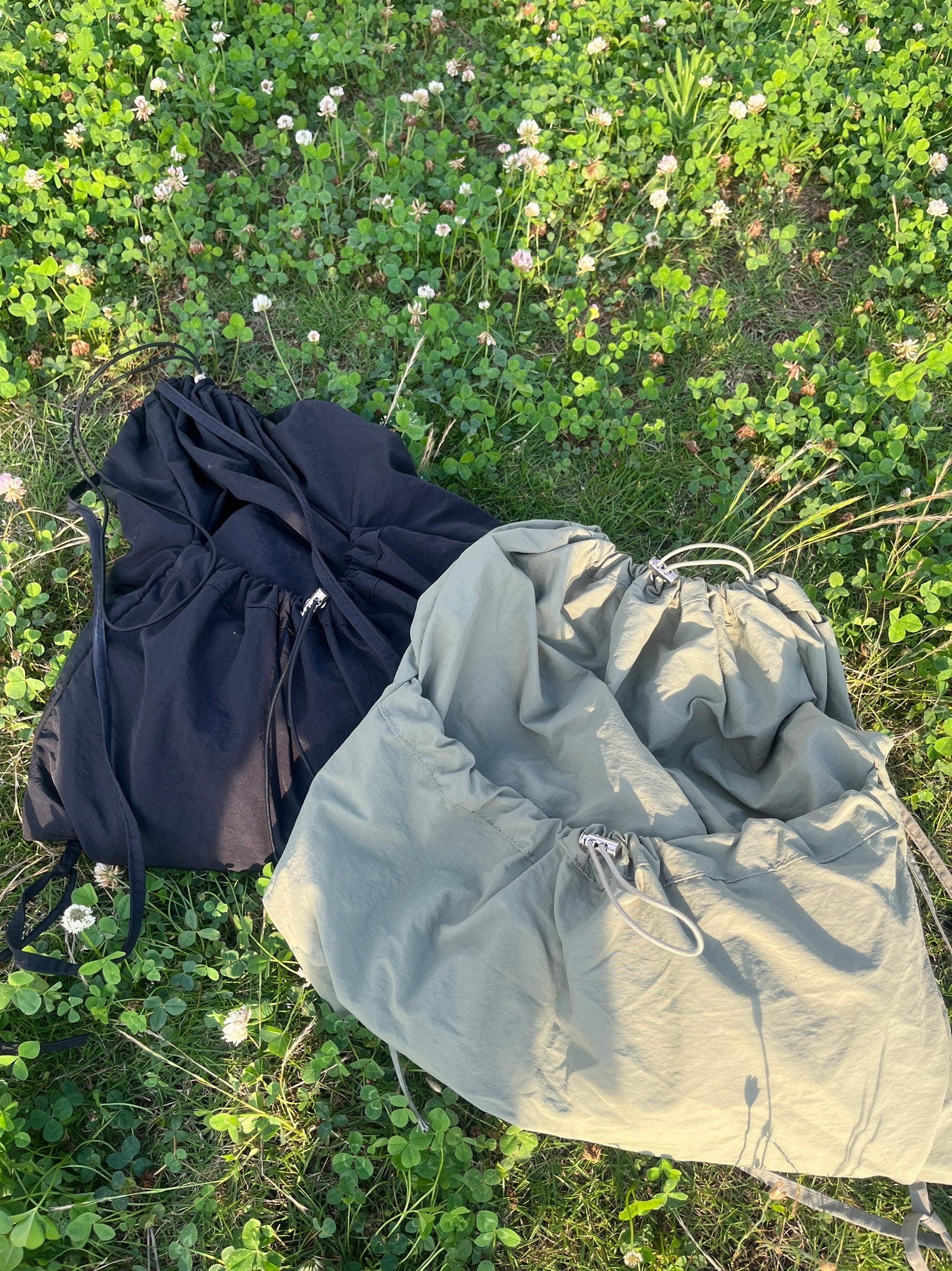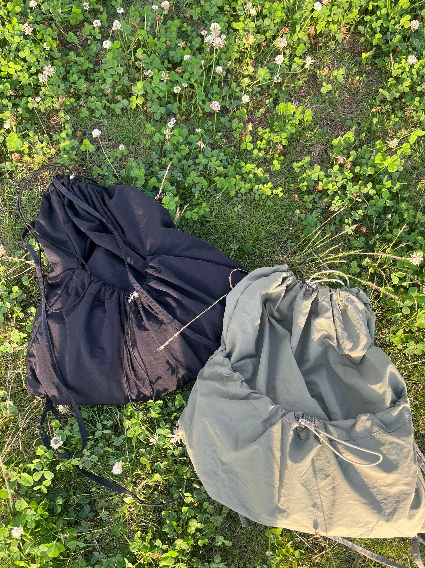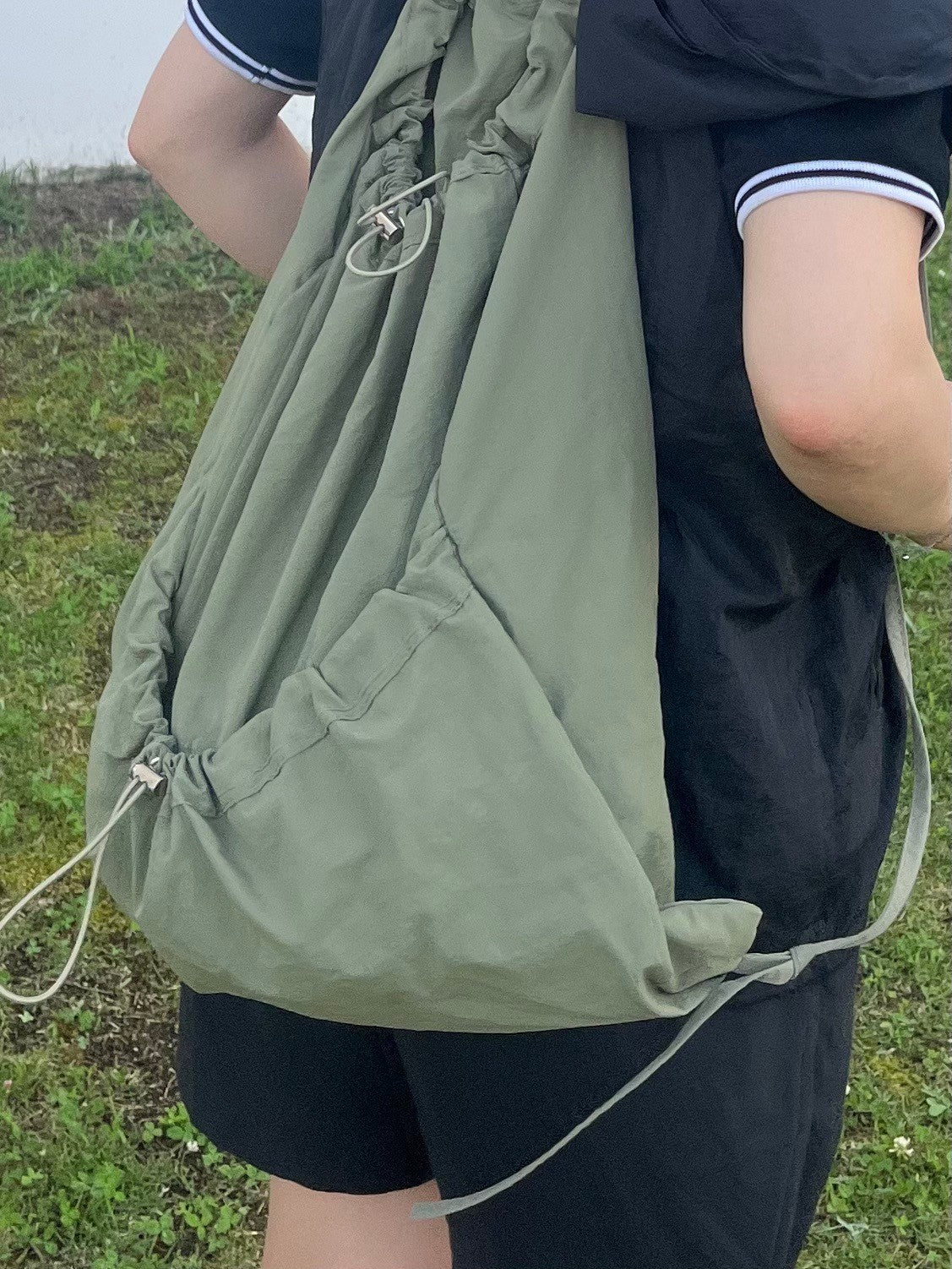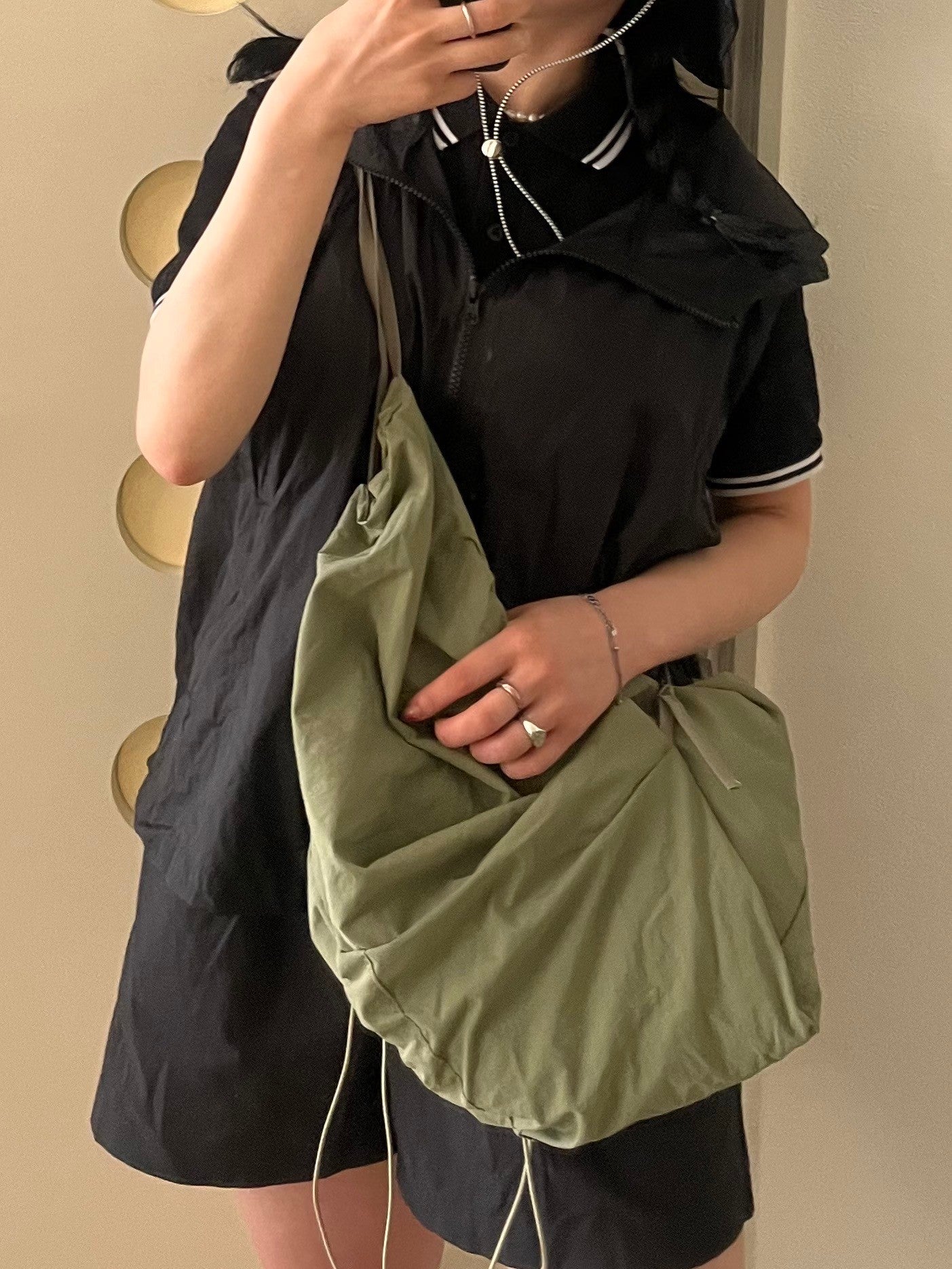程よいハリ感にシャカシャカとした軽い素材がポイント。季節問わず、シーズンレスで使っていただけます!ショルダー紐は結び目の位置を変えれば、長さ調節も可能です!