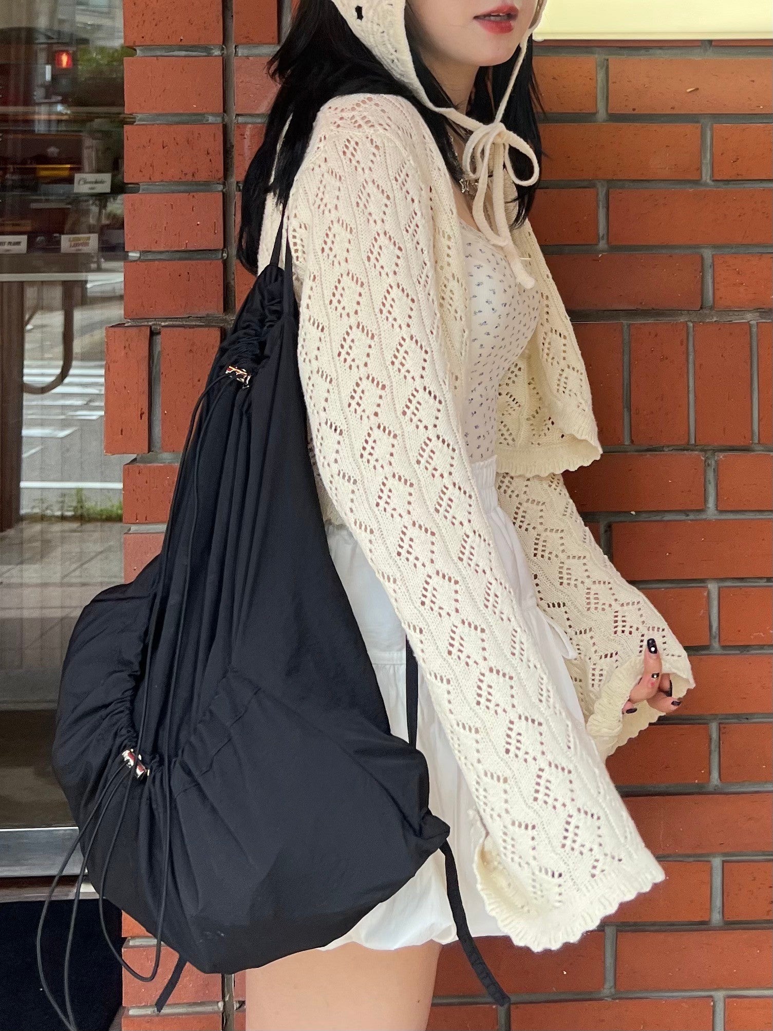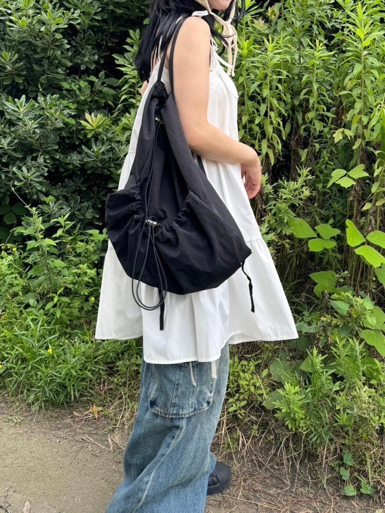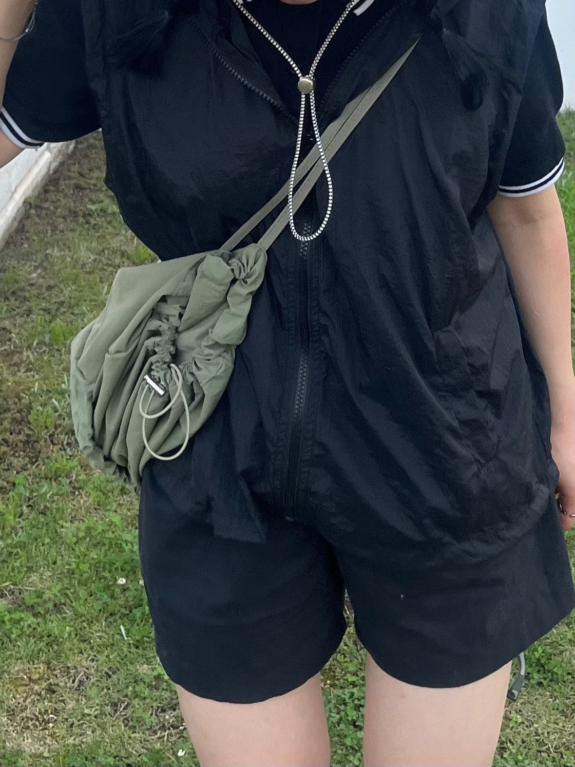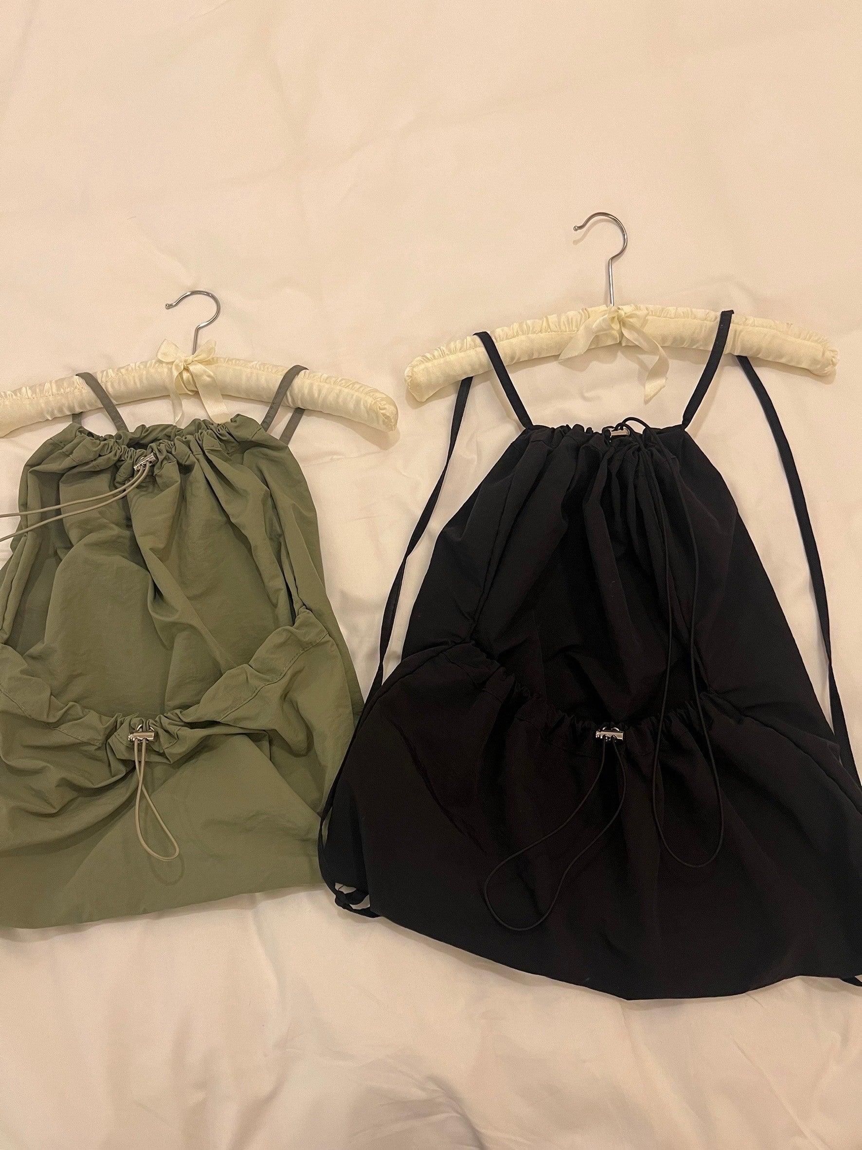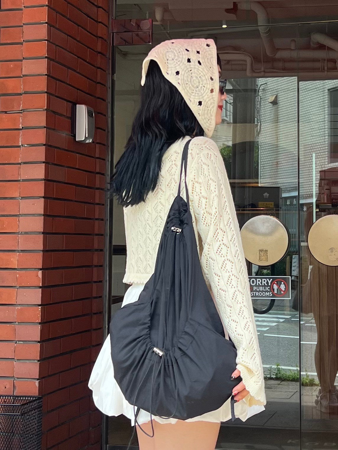 程よいハリ感にシャカシャカとした軽い素材がポイント。季節問わず、シーズンレスで使っていただけます!ショルダー紐は結び目の位置を変えれば、長さ調節も可能です!
