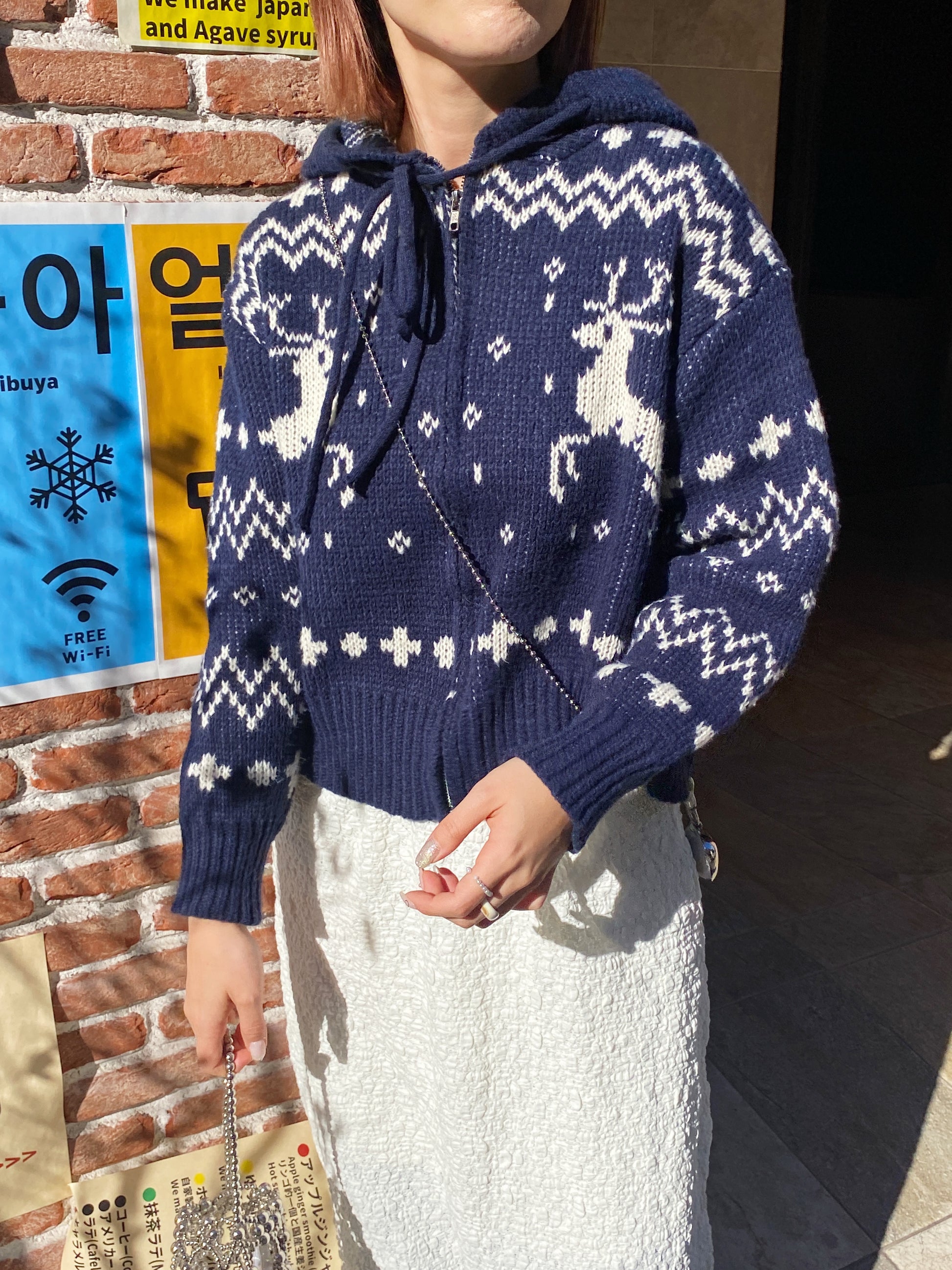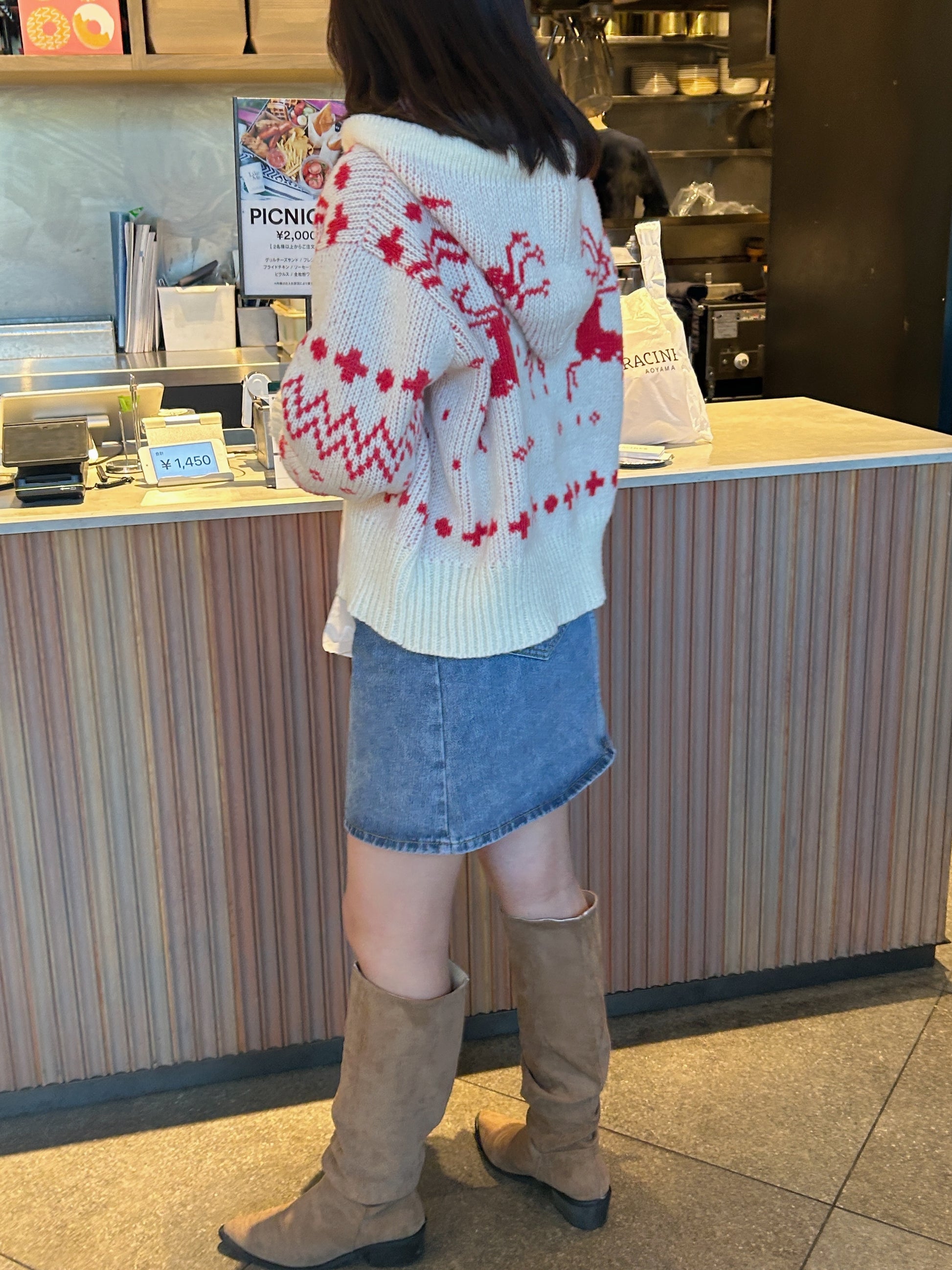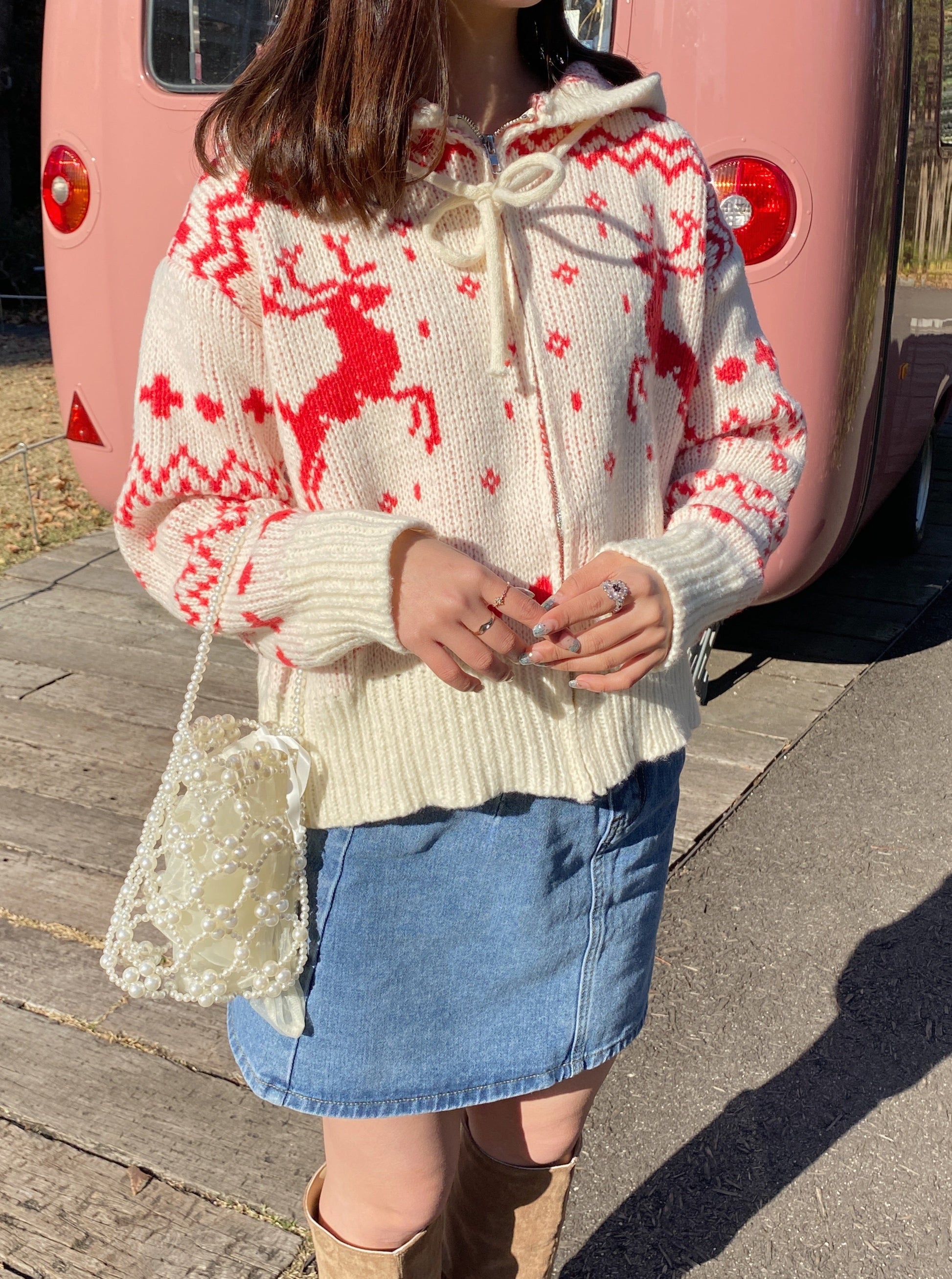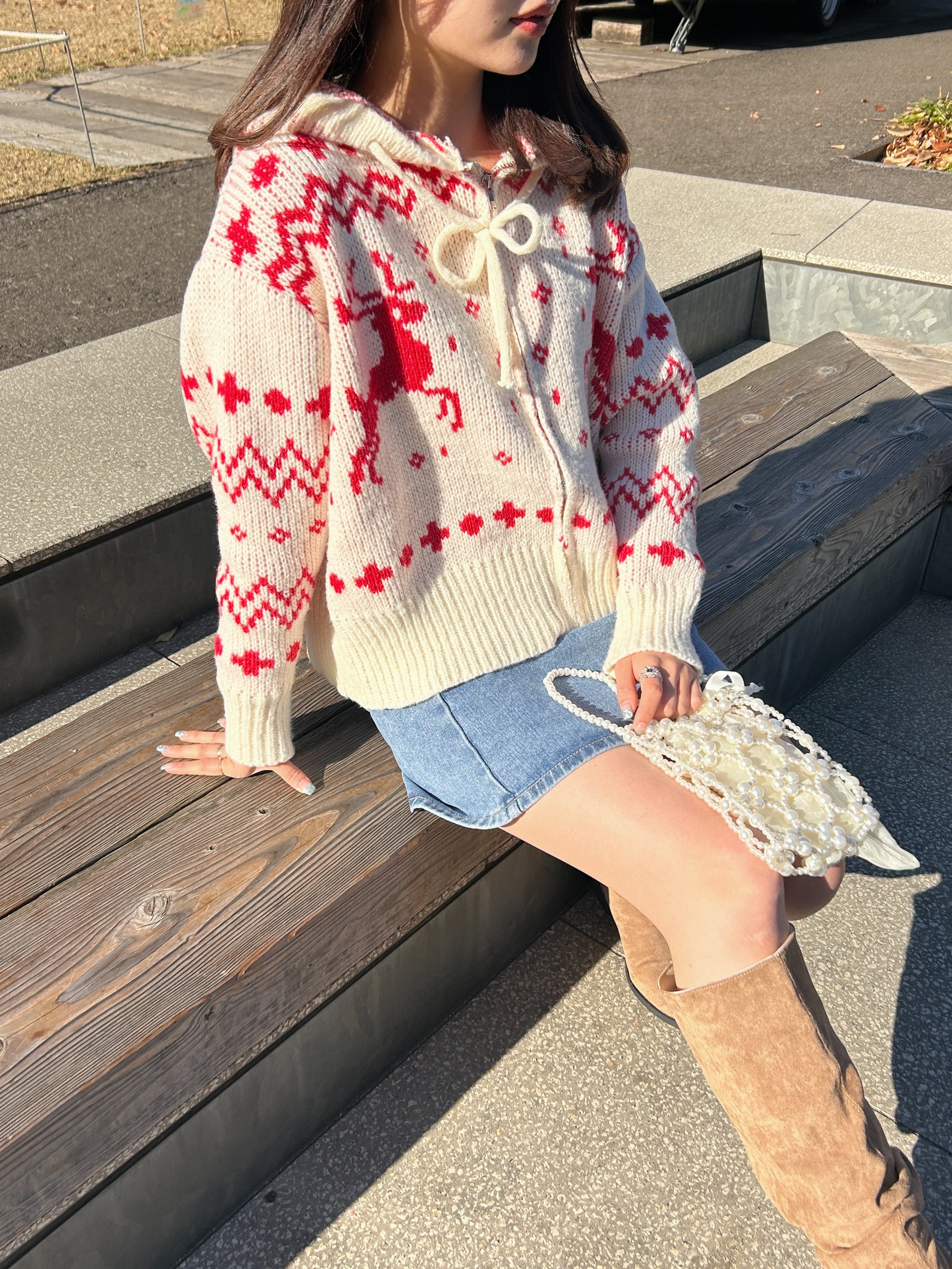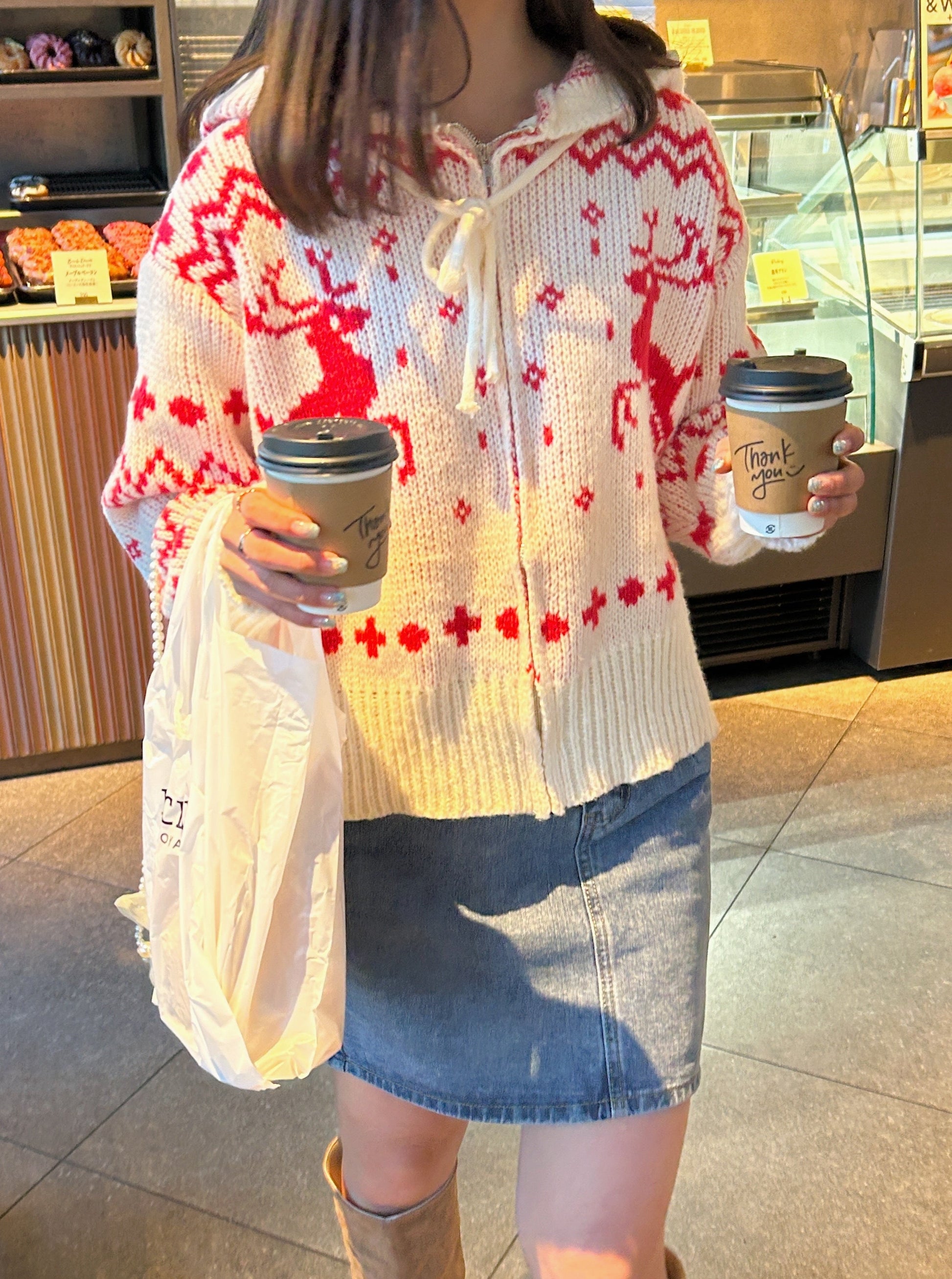 クリスマスにぴったりなジップアップカーディガンです。