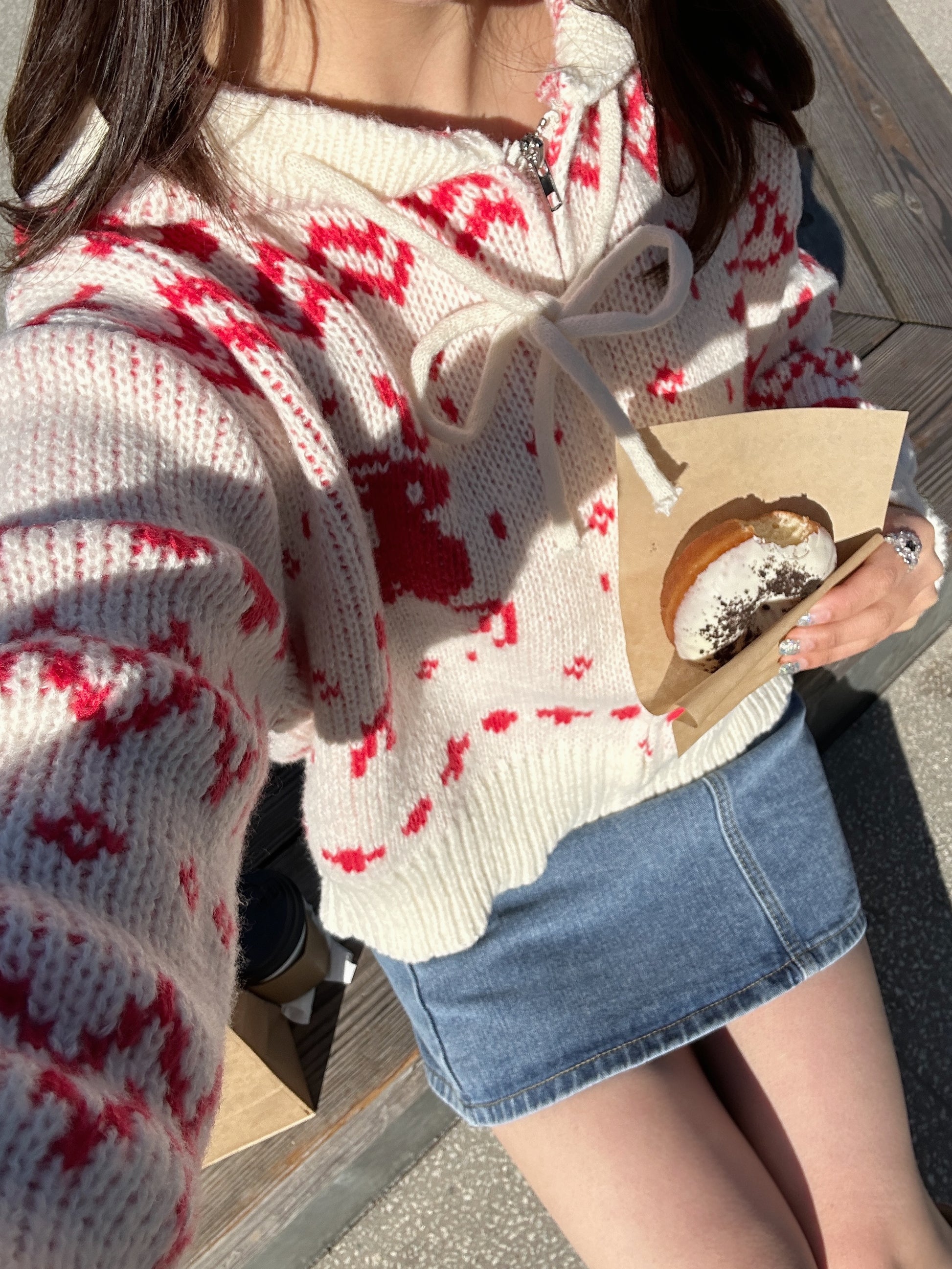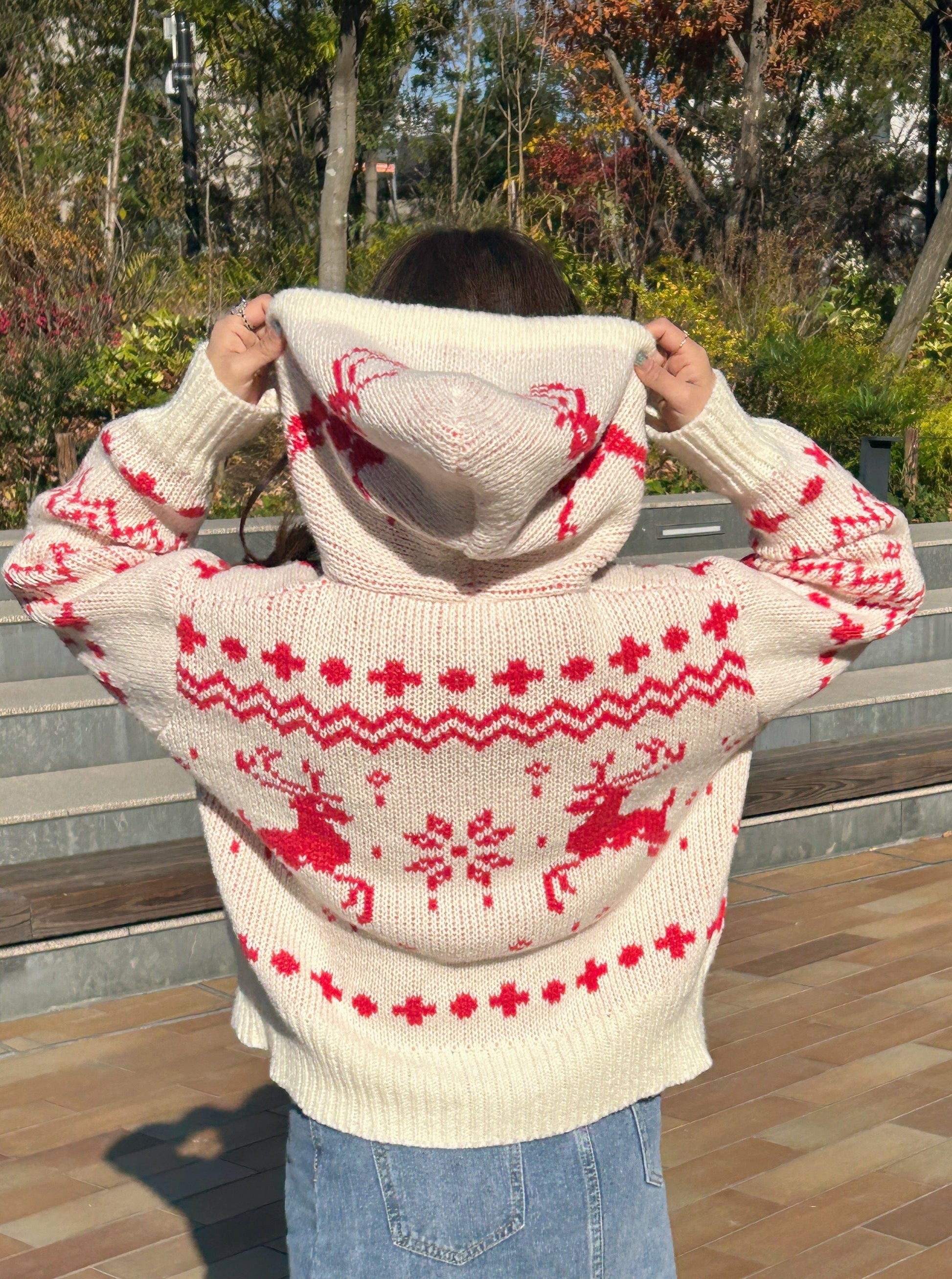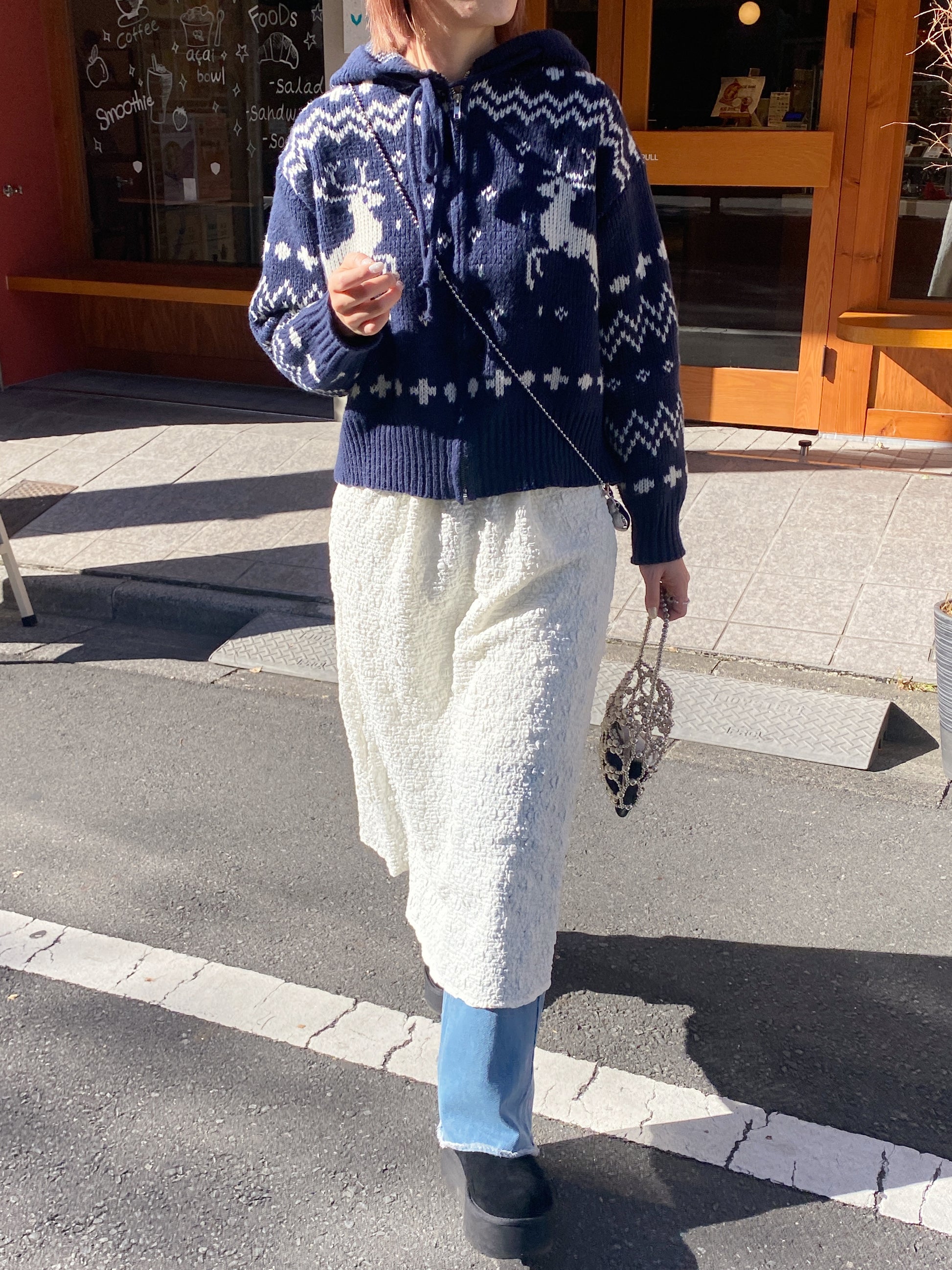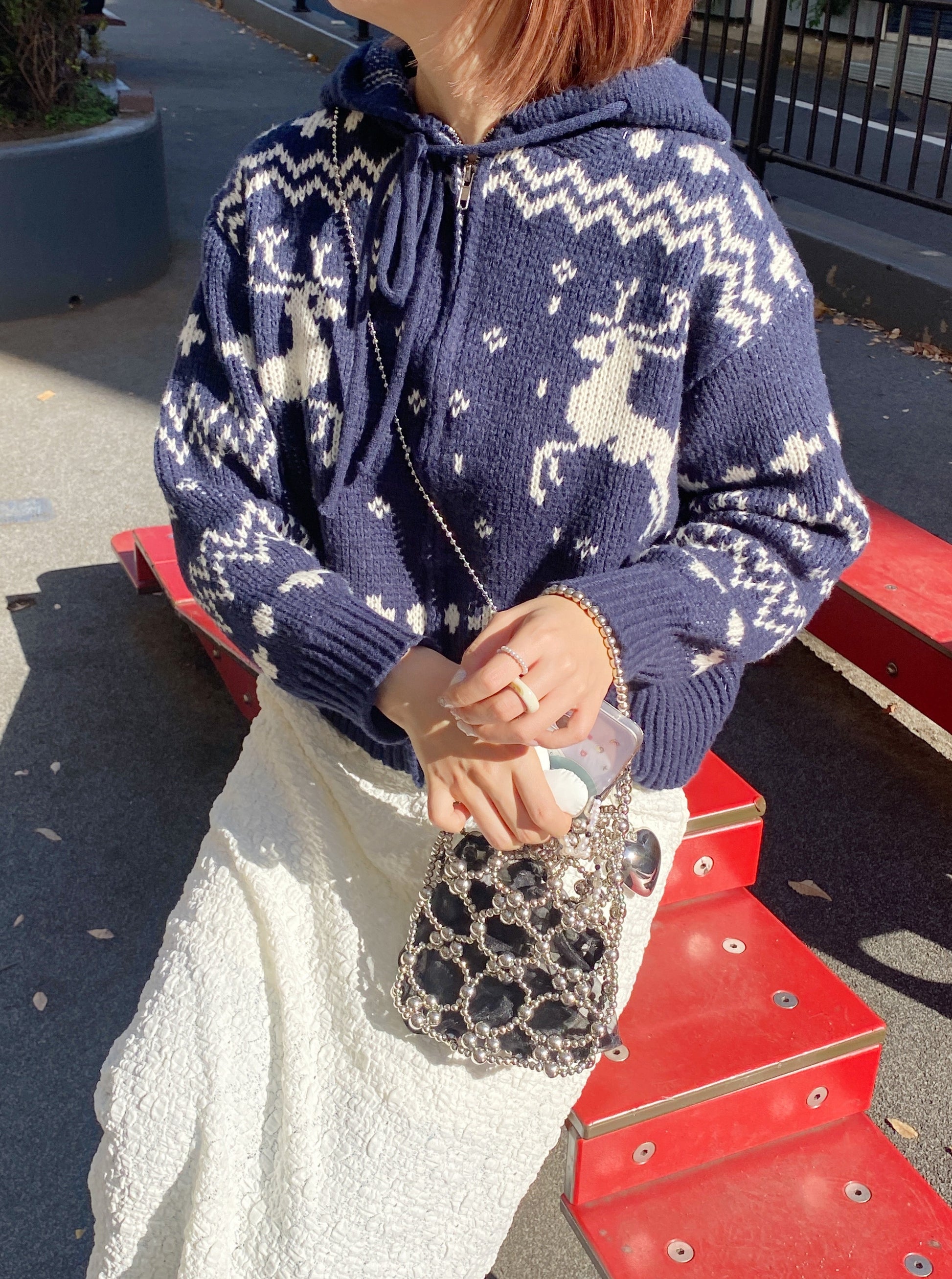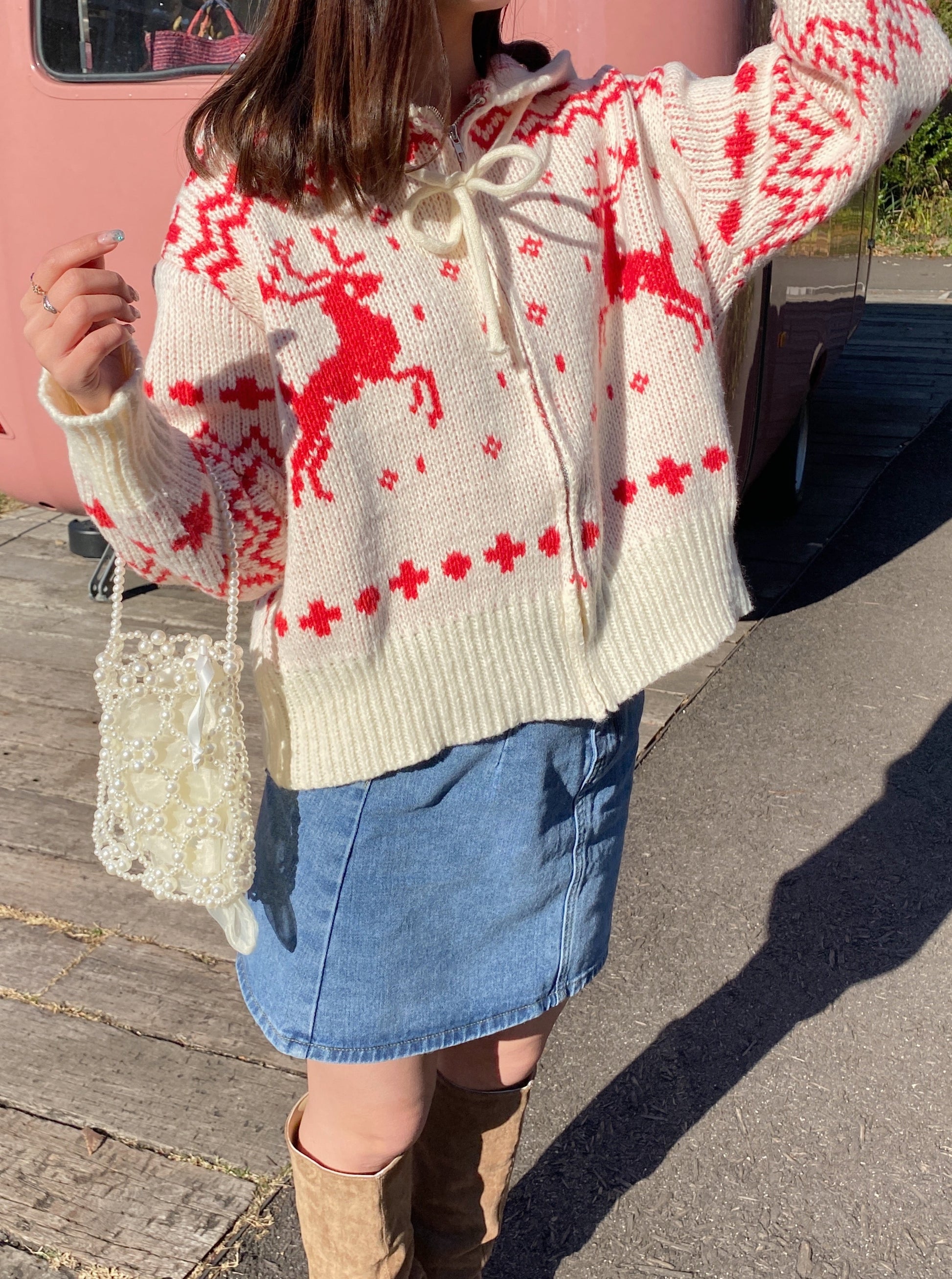 クリスマスにぴったりなジップアップカーディガンです。